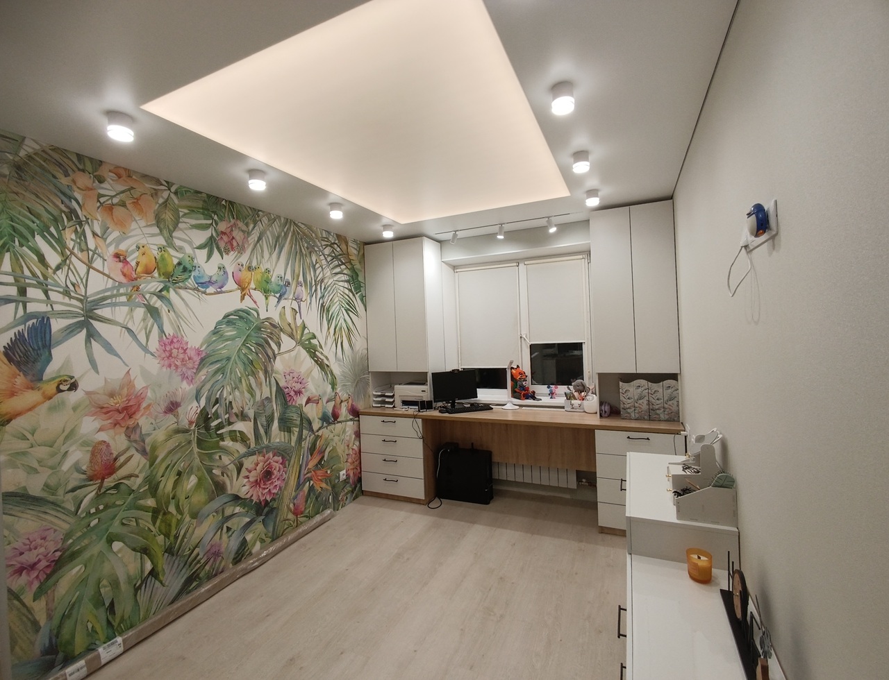 - Богатый выбор фактур и цветов. Большое разнообразие рисунков и оттенков. У нас в каталоге вы подберете оформление или закажете фотопечать изображений для девочек или мальчиков. При монтаже наши специалисты легко интегрируют в потолки люстры, светодиодные ленты, нестандартное освещение. Кроме того, при желании на натяжном потолке можно без проблем установить шведскую стенку или любой спортивный снаряд.